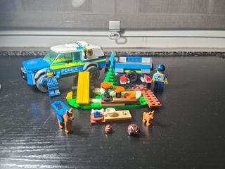 Set de entrenamiento canino de Lego City. Incluye figuras de policías y perros, un vehículo y accesorios. Contiene manual de instrucciones - Vehículo policial con remolque. - Figuras de policías. - Figuras de perros. - Accesorios de entrenamiento y campamento.