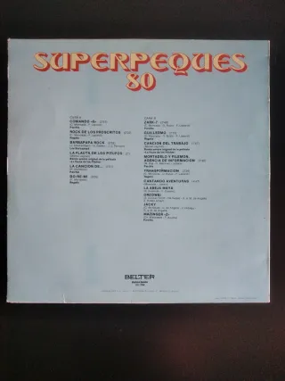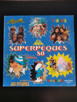 Disco recopilatorio de Superpeques 80 de Regaliz y Parchís. - Incluye La Flauta de Los Pitufos. - Incluye Las Aventuras de Guillermo. - Incluye La Batalla de los Planetas. - Incluye Barbapapa. - Sello Belter.