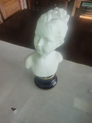 Figura de porcelana de una niña, con base azul y detalles dorados. - Diseño delicado. - Base decorativa.