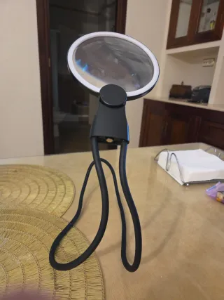 Lupa con luz LED y brazo flexible, ideal para lectura o manualidades. Incluye cargador USB. - Lente de aumento con anillo de luz LED. - Brazo flexible para posicionamiento. - Conexión USB para carga.