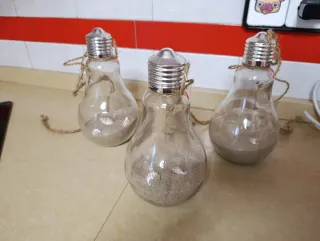 Originales bombillas decorativas rellenas de arena y pequeñas conchas marinas. Perfectas para dar un toque playero a tu hogar. - Diseño de bombilla de cristal. - Relleno de arena fina. - Incluye varias conchas marinas. - Cuerda rústica para colgar o decorar.