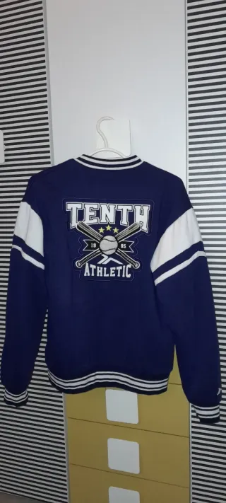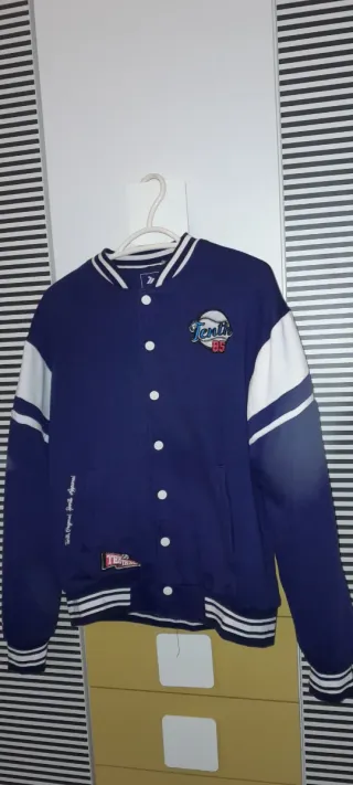 Cazadora estilo bomber en color azul marino con detalles en blanco. - Mangas blancas. - Cuello y puños de canalé con rayas blancas. - Cierre de botones a presión. - Parche bordado en la zona del pecho. - Bolsillos laterales. -detalle: la talla es más pequeña de lo que pone