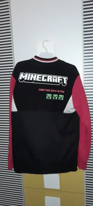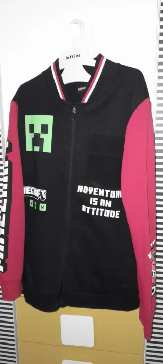 Cazadora estilo bomber con temática de Minecraft. Presenta un diseño llamativo en negro con mangas rojas. - Logo de Minecraft en verde en el pecho. - Inscripción ADVENTURE IS AN ATTITUDE en blanco. - Puños y cuello con detalles de rayas.