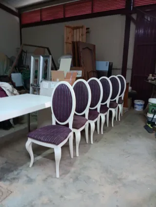 Elegante juego de mesa con sillas de comedor precio negociable - Tapicería morado. - Patas isabelina