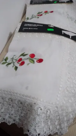 Conjunto de paños de mesa con un bonito bordado de ramas con cerezas rojas y detalles de encaje blanco. - Diseño bordado de cerezas. - Borde con encaje. - Color blanco.