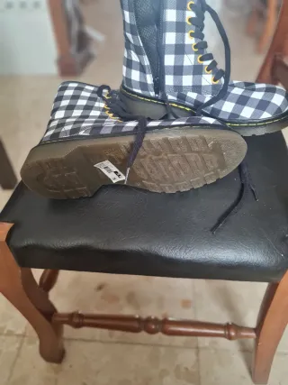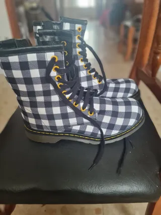 Botas de caña alta con un llamativo estampado de cuadros. - Diseño de cuadros blancos y negros. - Cierre de cremallera lateral. - Cordones negros con ojales amarillos. - Suela de goma característica.