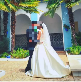 Vestido de novia estilo princesa, con un diseño elegante y romántico. Incluye vestido, 2 cancán y velo. Y funda donde va todo. El vestido tiene un uso, pero nunca se llevó a una tintorería. No tiene nada roto, solo está sucio. El vestido costó 3000€ - Escote pronunciado en la espalda. - Falda voluminosa.