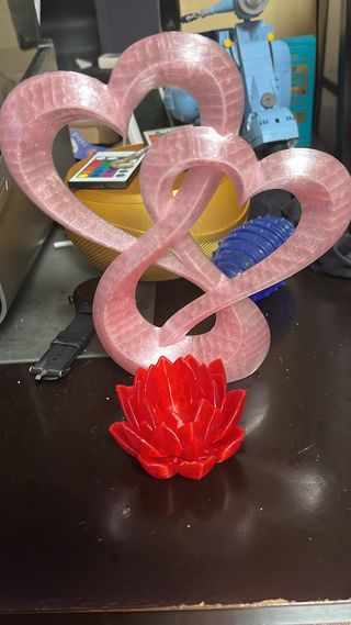 Figura decorativa tridimensional con un diseño de dos corazones entrelazados. - Color rosa brillante. - Acabado con textura. - Base de flor roja.