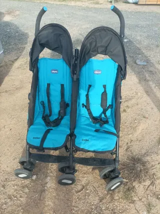 Cochecito doble Chicco Echo en color azul, perfecto para gemelos o hermanos con poca diferencia de edad. - Asientos acolchados. - Capotas independientes. - Arnés de seguridad de 5 puntos. - Ruedas delanteras giratorias.
