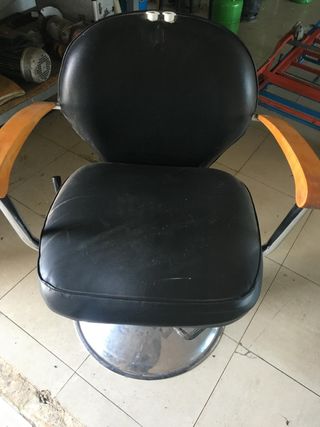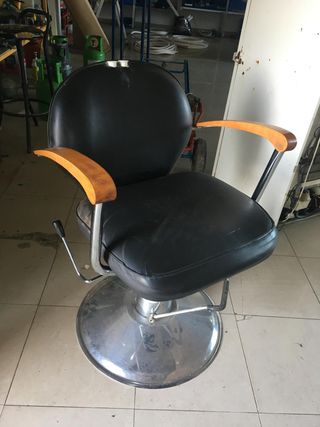 Silla de peluquería con un diseño clásico y elegante. - Tapicería de cuero sintético negro. - Reposabrazos de madera. - Base redonda cromada.