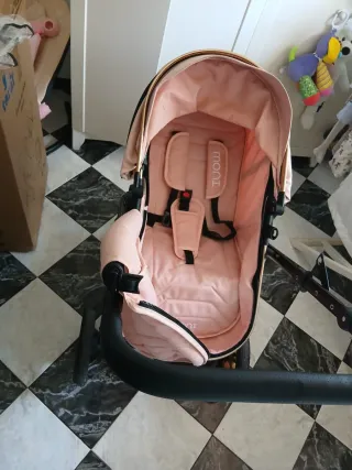 Cochecito de bebé de la marca Moni en color rosa con detalles dorados. Un diseño elegante y funcional. - Estructura metálica. - Capota ajustable. - Cesta de almacenamiento inferior.