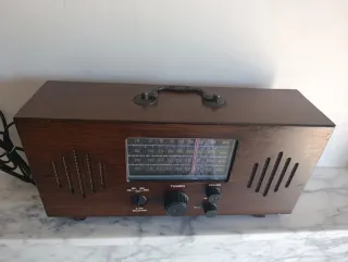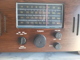 Radio de estilo vintage con acabado en madera. - Múltiples bandas: FM, MW, SW1, SW2. - Dial de sintonización. - Control de volumen y bass.