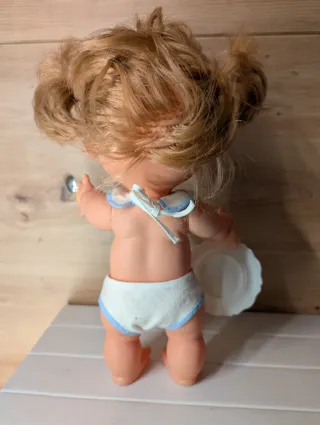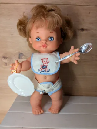 Muñeca de la marca Grasitas, lista para jugar a darle de comer. - Incluye plato blanco. - Incluye cuchara plateada. - Lleva un babero con un dibujo de osito. - Viste un pañal con detalles azules.
