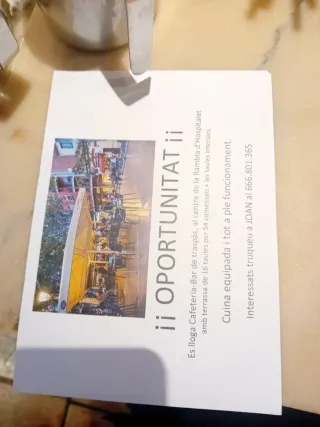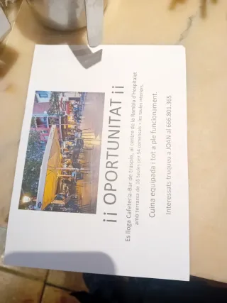 Se traspasa bar de tapas con gran terraza de 16 mesas en plena rambla just oliveras de hospitalet centro, 2500 de alquiler iva incluido, muy buena zona a lado de la policía, colegio, ambulatorio y cerca del metro, también sirve para montar una panadería ya que ninguna tiene terraza en toda la rambla, muy buena zona, el inquilino que hay estuvo 19 años y ya se jubila