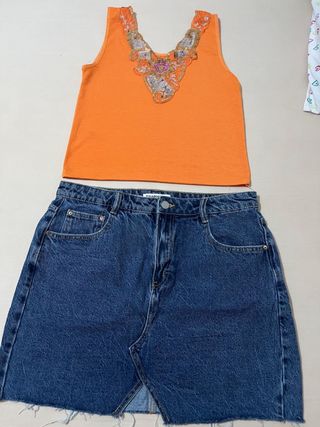 Top Naranja con Bordado y Falda Vaquera