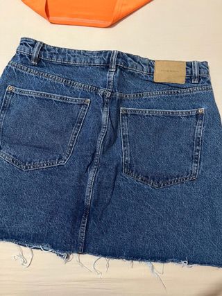 Conjunto de top naranja con detalles bordados y falda vaquera. - Top sin mangas de color naranja vibrante. - Cuello con adornos bordados y pedrería. - Falda vaquera de corte recto. - Bajo deshilachado.
