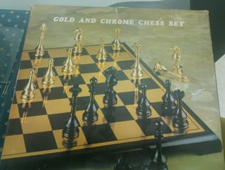 Tablero de figuras metálicas de color dorado y negro con su caja original y tapa de corcho