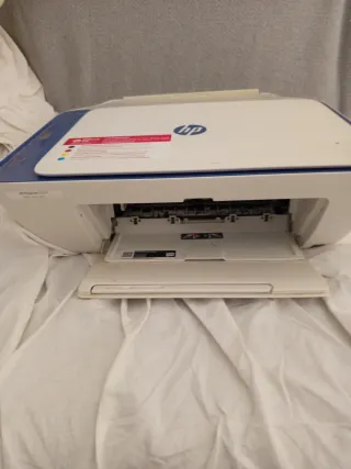 Impresora multifunción HP en color blanco y azul. - Incluye plan de impresión gratuita por 2 meses. - Conexión Wi-Fi. - Escáner y copiadora.
