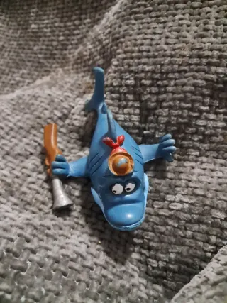 Figura de un delfín azul con un diseño divertido y caricaturesco. - Delfín de color azul. - Lleva un sombrero marrón y un pañuelo rojo. - Sostiene un arma de color marrón y plateado.