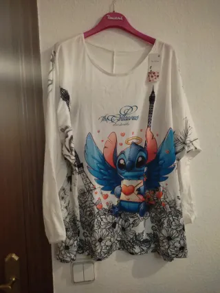 Camiseta fina con estampado de Stitch y Torre Eiffel. - Disponible en tallas XL y 2XL. - Diseño con flores y corazones. - Manga larga.mide de sisa a sisa 78.es manga anchita .preciosa.nueva con su etiqueta