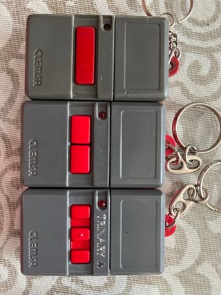 Mando de garaje Clemsa trinary en color gris con botones rojos. - Diseño compacto. - Incluye llavero. -modelos mt1, mt2 y mt3, este ultimo raro de ver Negociable