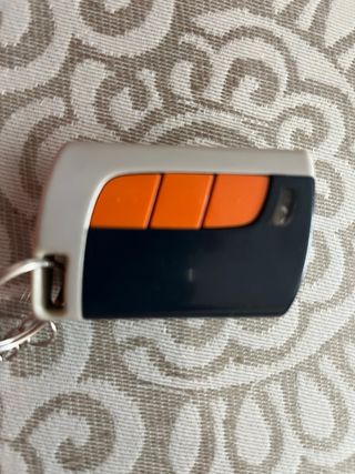 Mando a distancia para garaje con un diseño moderno. - Tres botones de color naranja. - Carcasa en color gris y negro. - Incluye llavero.