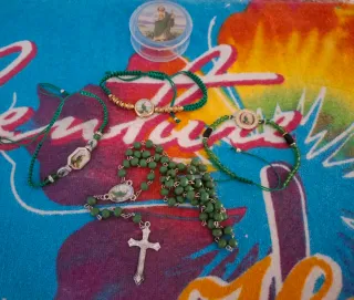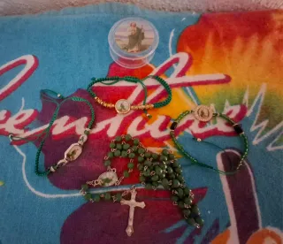 Conjunto de artículos religiosos de San Judas Tadeo. - Pulsera verde con medalla. - Pulsera verde con cuentas doradas y medalla. - Pulsera verde con cuentas negras y medalla. - Rosario verde con cruz plateada y medalla.