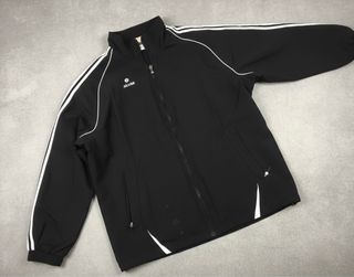 Chaqueta deportiva negra con detalles blancos. - Cierre completo de cremallera. - Cuello alto. - Puños y bajo elásticos. - Dos bolsillos laterales con cremallera.