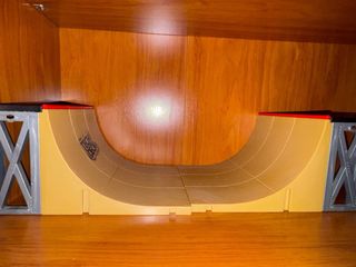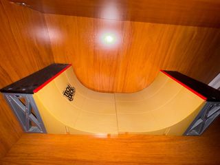 Rampa para patinetes Tech Deck. Ideal para practicar trucos. - Diseño de media-luna. - Color amarillo. - Soporte gris. - Borde rojo.