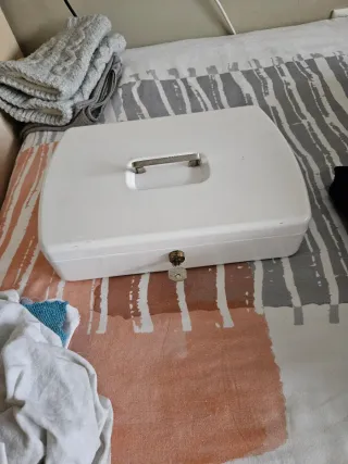 Caja metálica de la marca Burg-Wachter para organizar monedas. - Compartimentos para diferentes valores de monedas. - Diseño en color azul y blanco. - Cierre con llave.