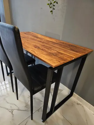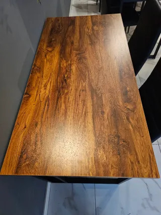 Mesa de escritorio con un diseño moderno y acabado en madera. - Superficie amplia para trabajar o estudiar. - Patas metálicas negras.