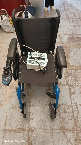 Silla de ruedas eléctrica marca Powertec, ideal para facilitar la movilidad. - Diseño robusto y funcional. - Reposabrazos acolchados. - Joystick de control intuitivo. - Ruedas traseras grandes para mayor estabilidad.