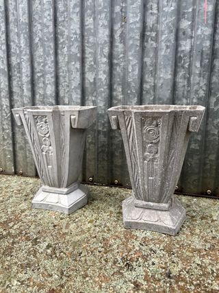 Conjunto de dos maceteros antiguos con un diseño clásico y elegante. - Material: Piedra artificial o similar. - Diseño: Estilo Art Déco con motivos florales. - Base: Pedestal octogonal. - Color: Gris piedra.
