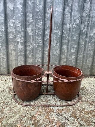 Este centro de mesa de estilo rústico es perfecto para añadir un toque decorativo a tu hogar. - Diseño con dos cubos para velas o flores. - Fabricado en metal con acabado oxidado. - Soporte central y base de alambre.