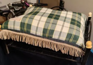 Cama de hierro para mascotas con un cojín a cuadros verdes y blancos. El cojín tiene flecos decorativos. - Estructura de hierro. - Cojín con diseño a cuadros.