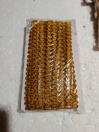 Cinta dorada con un diseño trenzado y ondulado, ideal para manualidades y decoración. - 12 metros - 11 mm - Color: Dorado - Diseño: Trenzado - Acabado: Brillante Tengo varias unidades