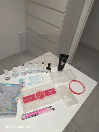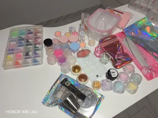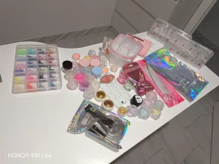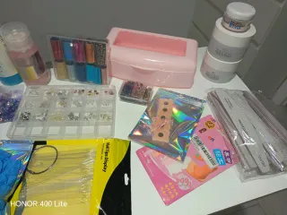 Conjunto de accesorios para manicura y decoración de uñas. - Polvos acrílicos en color cover pich /extra White 60g cada uno . - Set de limas de uñas profesionales. - papel foul y decoraciones 3D para uñas. - Dos botes de remover . - caja exterminadora . -celulosas sin pelusa . -guantes de nitrilo . -expositor tips. etc.