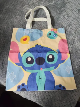 Bolso de tela con un divertido diseño de Stitch, perfecto para llevar tus cosas. - Diseño de Stitch saliendo de un agujero. - Letras STITCH en relieve. - Detalles en azul y rosa.