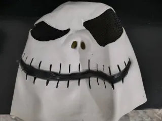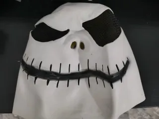 Máscara inspirada en Jack Skellington, personaje de Pesadilla antes de Navidad. - Diseño blanco con detalles negros. - Aberturas para ojos con malla. - Boca cosida con puntadas negras.