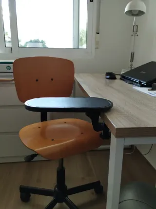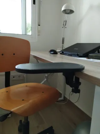 Reposabrazos negro para escritorio o mesa, se sujeta con tornillo regulable, no daña el mueble, para descansar el antebrazo y la muñeca, apto para zurdos, pues se coloca donde se quiera - Color: Negro. - Material: Plástico.