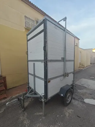 Remolque ducha con documentación el remolque se desmonta Desmontado se queda en la mitad de altoperfecto para llevar sillas y mesas.. es fácil montarlo y desmontarlo por un sistema de poleas Pronto subiré fotos desmontado Lleva batería recién puesta Bomba de agua con ducha Luces led en el interior Deposito de agua potable de 75Litros Depósito de aguas grises de 150L con una llave muy fácil de vaciar Estructura robusta y duradera. Paneles Sandwich aislantes. Rueda de repuesto. Ventana alta para airearlo Lleva un sistema muy curioso para calentar el agua de la ducha con un camping gas Perfecto para una Camper sin baño