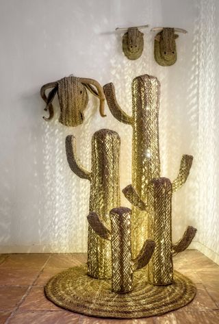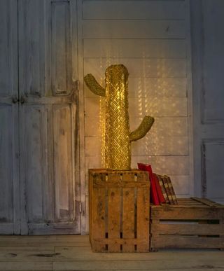 En venta cactus de esparto con armazón de madera y luces led en su interior, de lad medidas 53x40x13 cm; 70x40x17 cm.; 105x60x22 cm.; 145x60x22 cm. y, 180x60x30cm. Precios de 45€; 61€; 74€; 85€ y 118€.