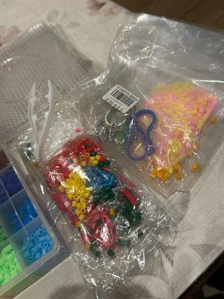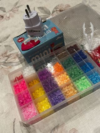 Set de cuentas Hama para crear diseños. Incluye plancha y adaptador. - Caja organizadora con múltiples compartimentos. - Variedad de colores de cuentas. - Plancha para fusionar las cuentas. - Adaptador de corriente.