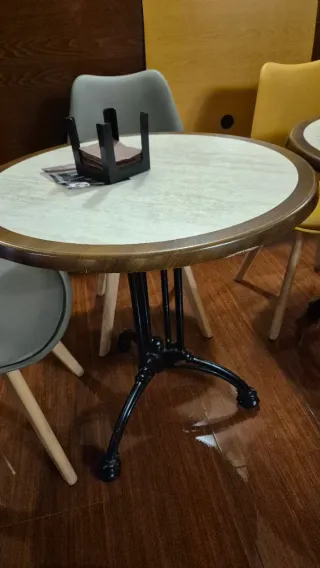 Mesa redonda de estilo cafetería con base de hierro fundido.Dispongo de 4 en color claro y 2 de color oscuro el precio es cada una. - Tablero de imitación mármol con borde de madera. - Base de hierro negro con patas ornamentadas. - Ideal para espacios pequeños o como mesa auxiliar,medidas 70 x70