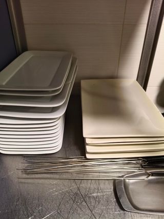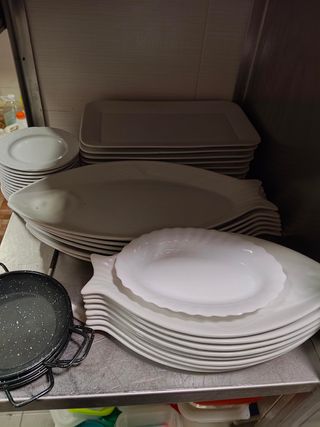 Conjunto de vajilla blanca, ideal para cualquier ocasión. - Platos rectangulares grandes. - Platos con forma de pez. - Platos redondos. - Un cazo negro.