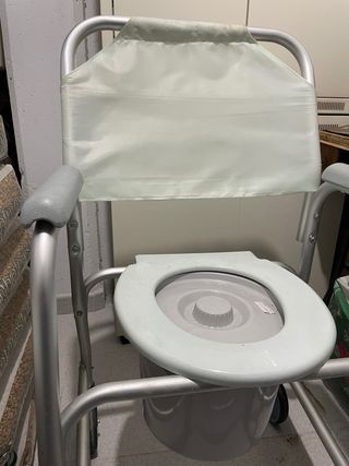 Silla de ducha y WC con estructura metálica. - Asiento con tapa. - Cubo extraíble. - Reposabrazos.