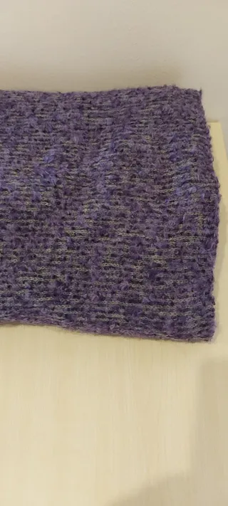 Retal de tejido de punto doble faz con un diseño texturizado. - Tejido con hilos morados y detalles en tonos más claros en gris. - Textura suave y mullida al tacto. - Colores malva y gris por una cara y gris con pequeños toques malva por la otra. - Mide 128 x 145 cm. - No ha sido usado, por lo que no tiene defectos.