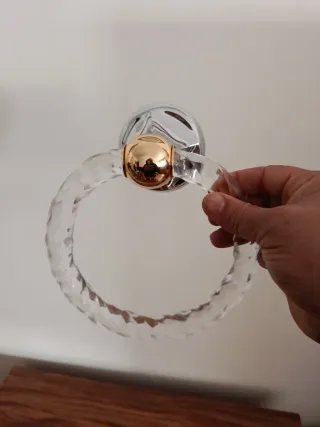 Elegante toallero con un diseño moderno y llamativo. - Aro de acrílico transparente con acabado facetado. - Bola central decorativa en acabado dorado. - Soporte de pared cromado.