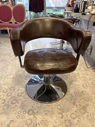Silla de peluquería con base hidráulica y acabado en polipiel marrón. Siete unidades Alguna se tiene que tapizar - Altura regulable mediante sistema hidráulico. - Base redonda cromada. - Asiento y respaldo acolchados.