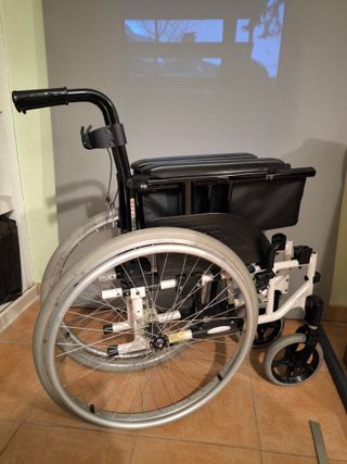 Silla de ruedas con ruedas grandes y estructura blanca. - Ruedas traseras de gran tamaño. - Ruedas delanteras giratorias. - Asiento viscoelástica y respaldo ergonómico - Reposabrazos negros. Medidas : asiento 50 fondo x 45 ancho (costó 900€) Respaldo 48 alto x 37 ancho